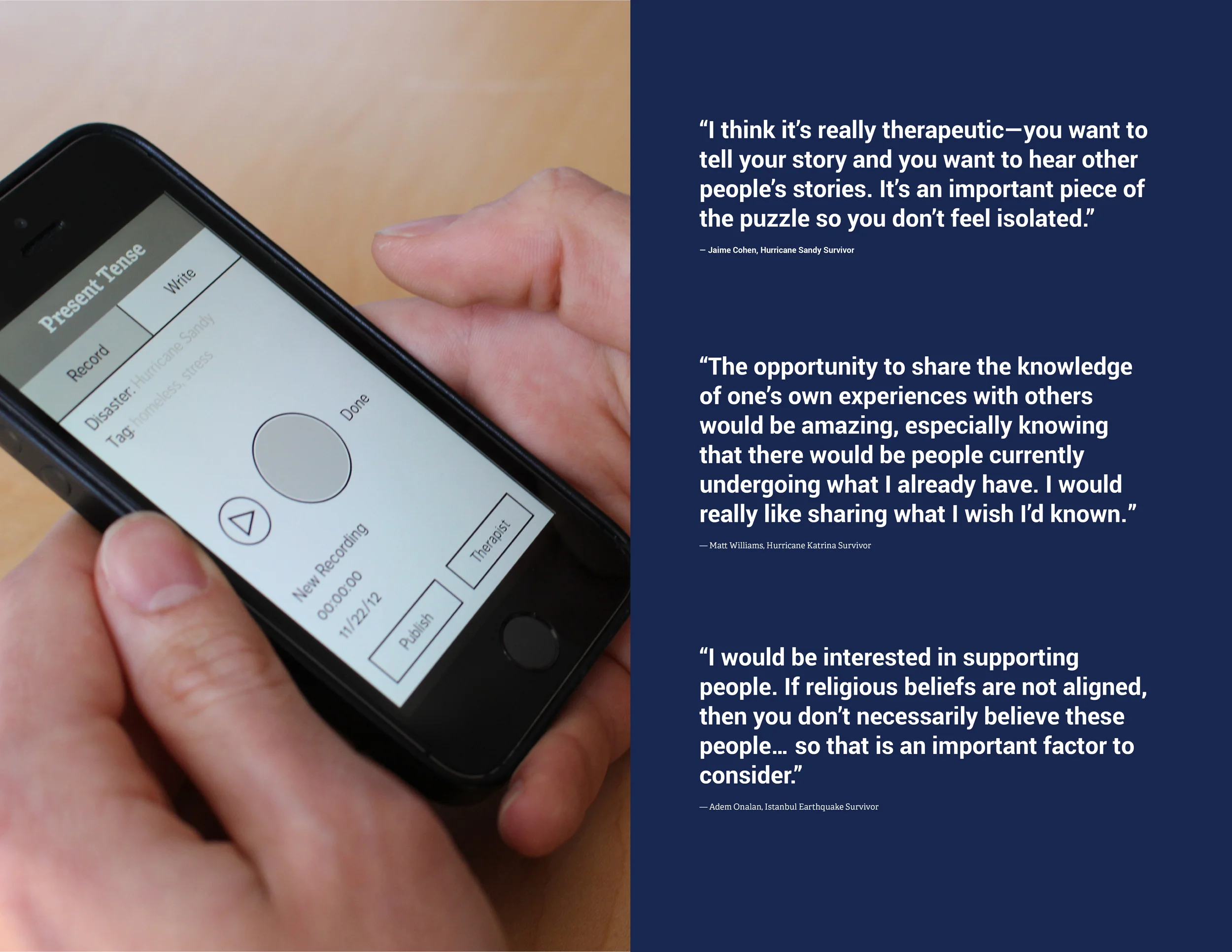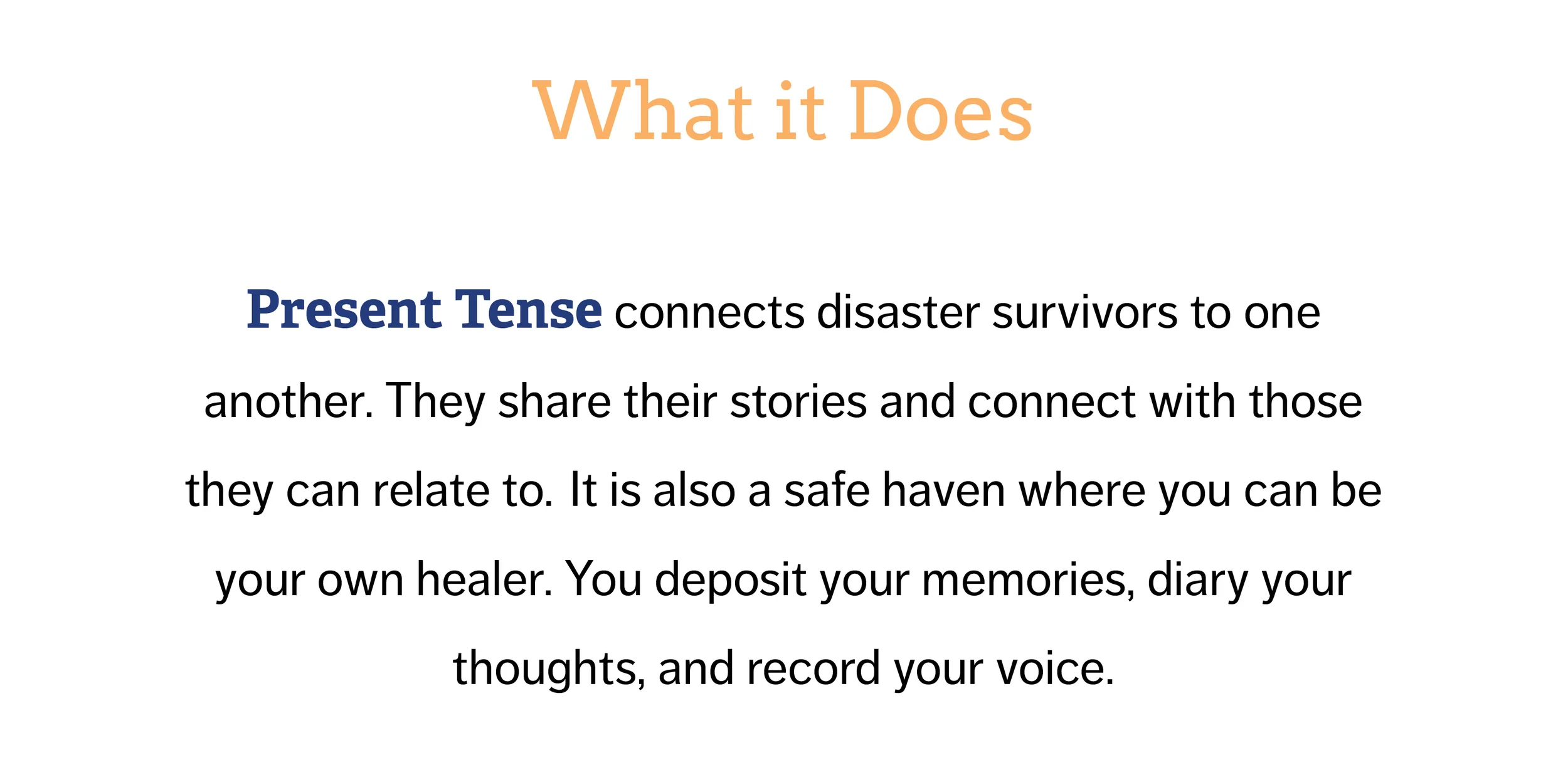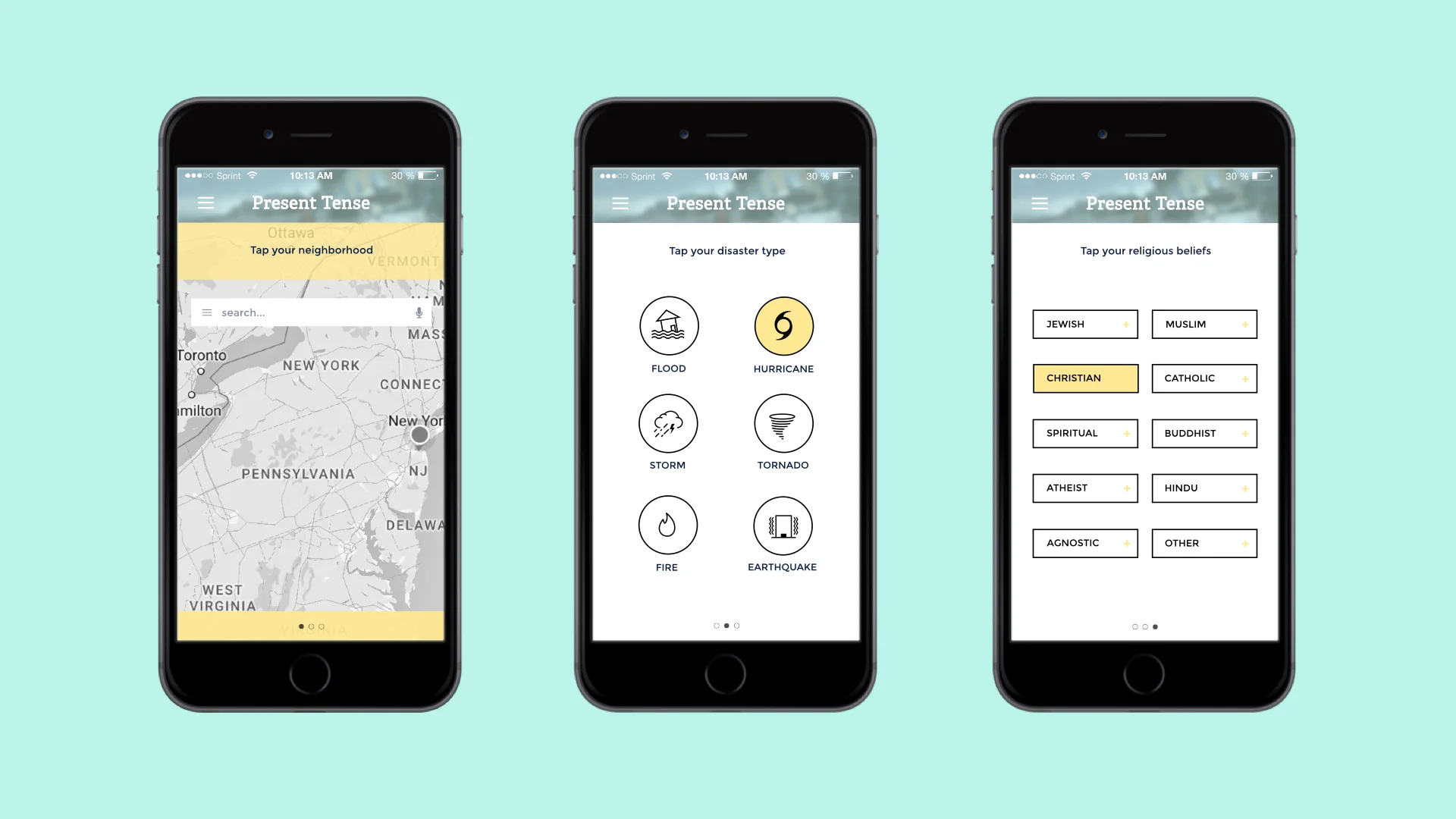 Leveraging the power of social problem solving and resilience building, in combination with healing by re-experiencing a traumatic event, Ayaydin developed the service Present Tense, a real time disaster story-sharing platform. Using information and filters about their neighborhood, disaster type, and beliefs, survivors can talk about and hear about other’s disaster experiences and connect with those they can relate to.