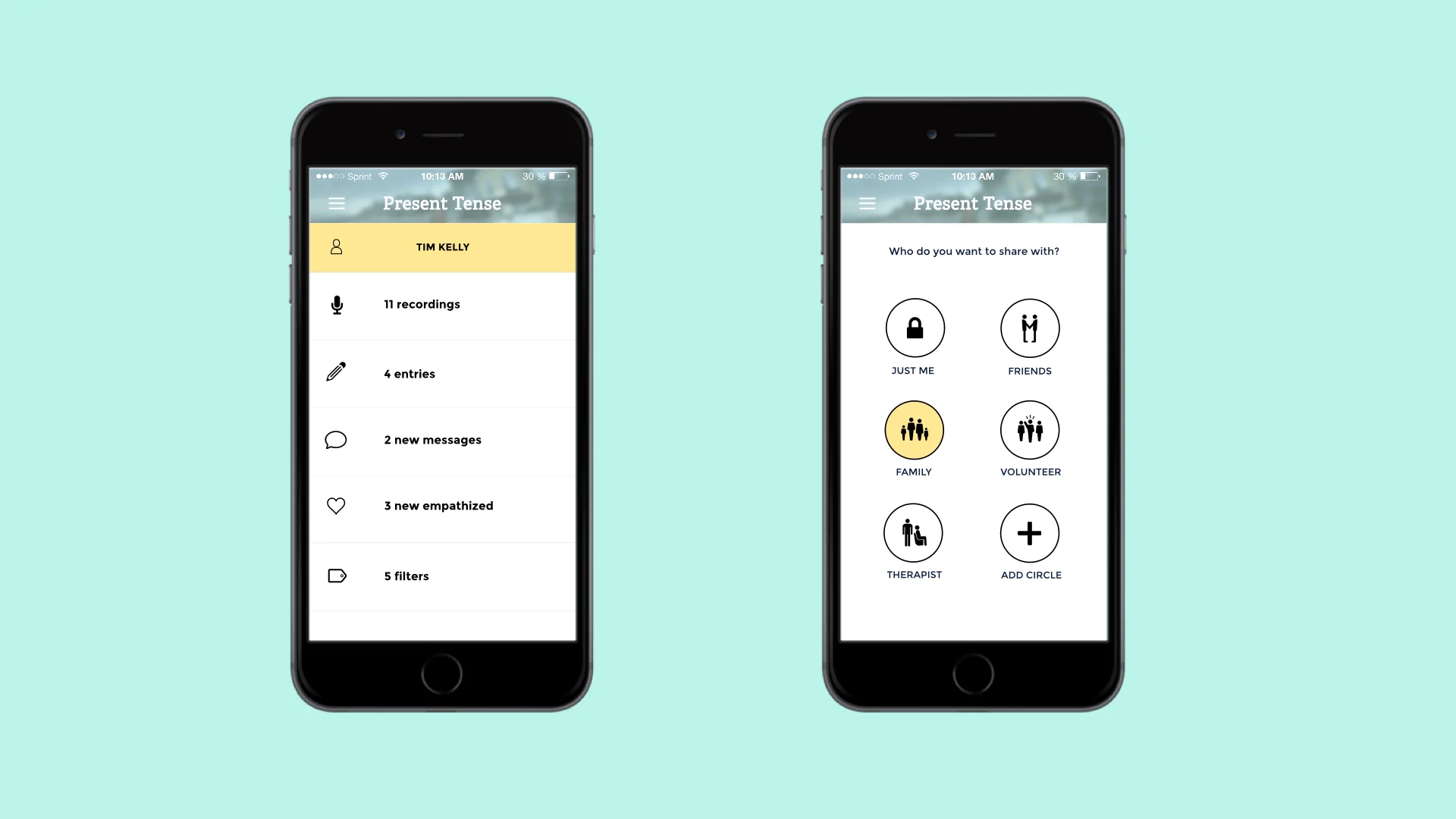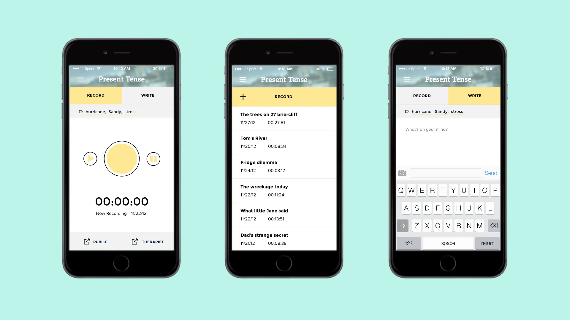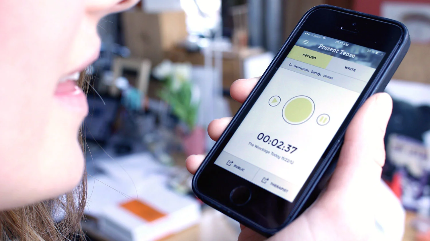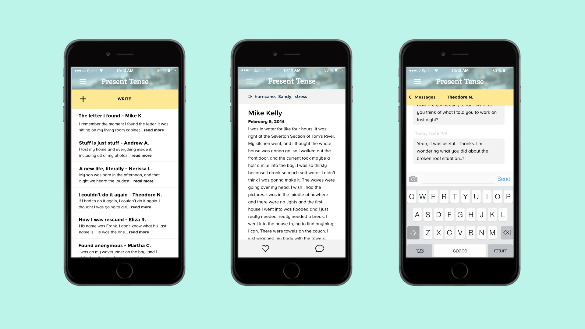 Leveraging the power of social problem solving and resilience building, in combination with healing by re-experiencing a traumatic event, Ayaydin developed the service Present Tense, a real time disaster story-sharing platform. Using information and filters about their neighborhood, disaster type, and beliefs, survivors can talk about and hear about other’s disaster experiences and connect with those they can relate to.