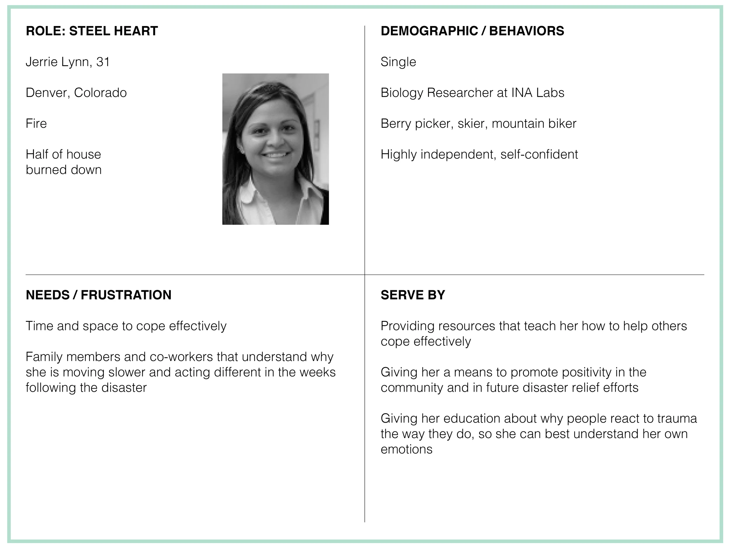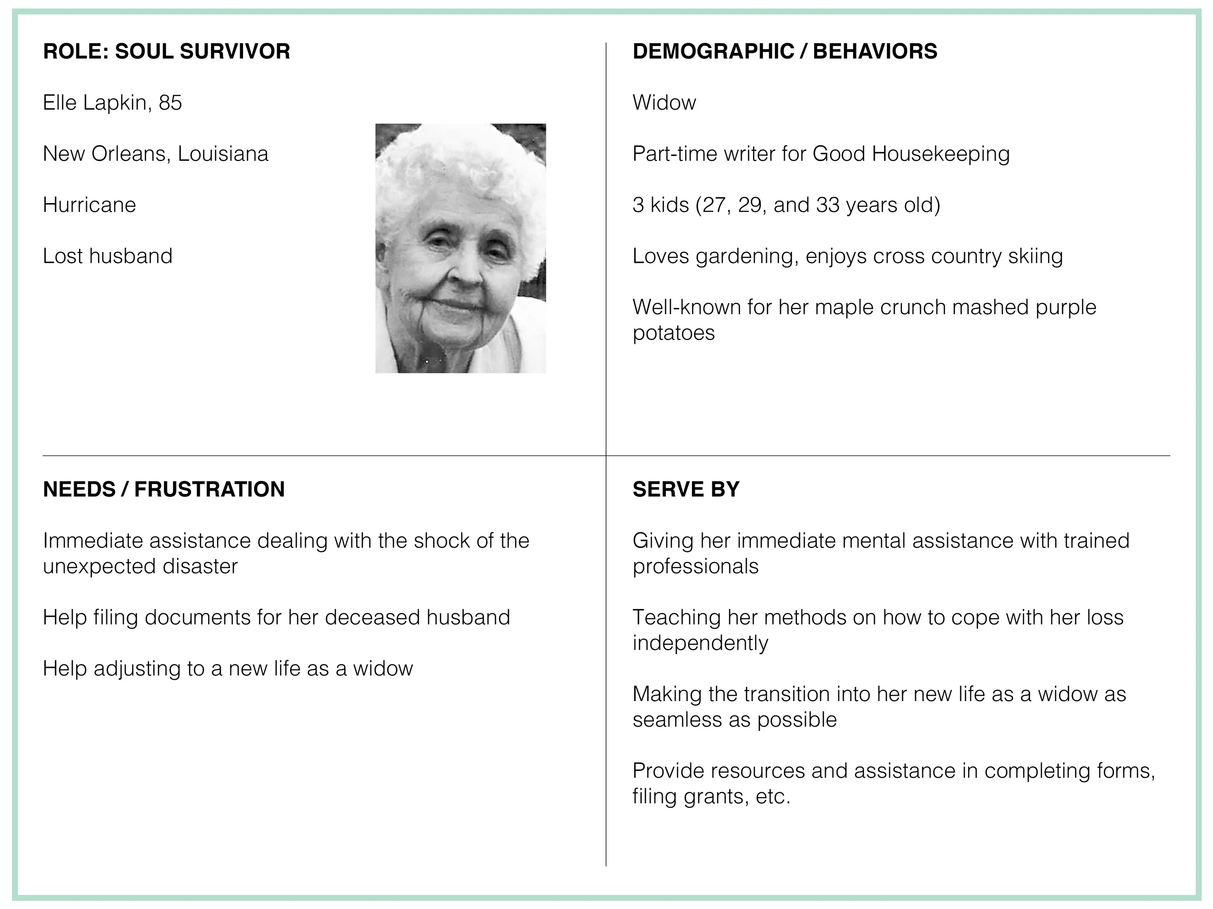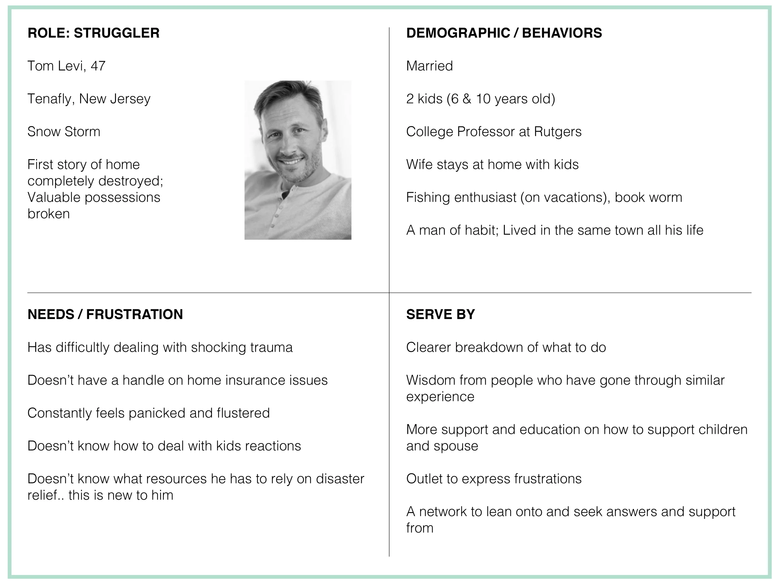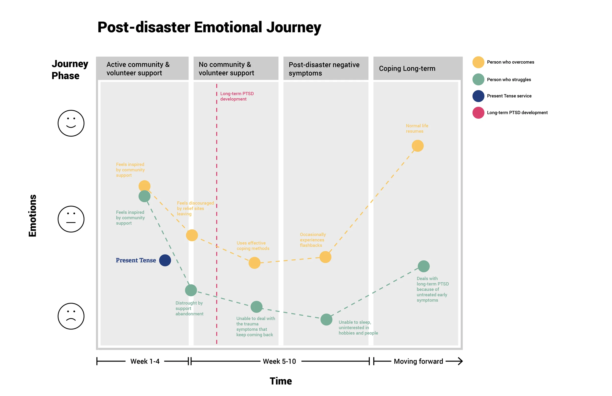 I started off by creating 4 personas as a representation of the goals and behavior of real disaster survivor types. I use these as a guidance when envisioning the future product offerings for mental relief. The Present Tense service has a place for all the users.