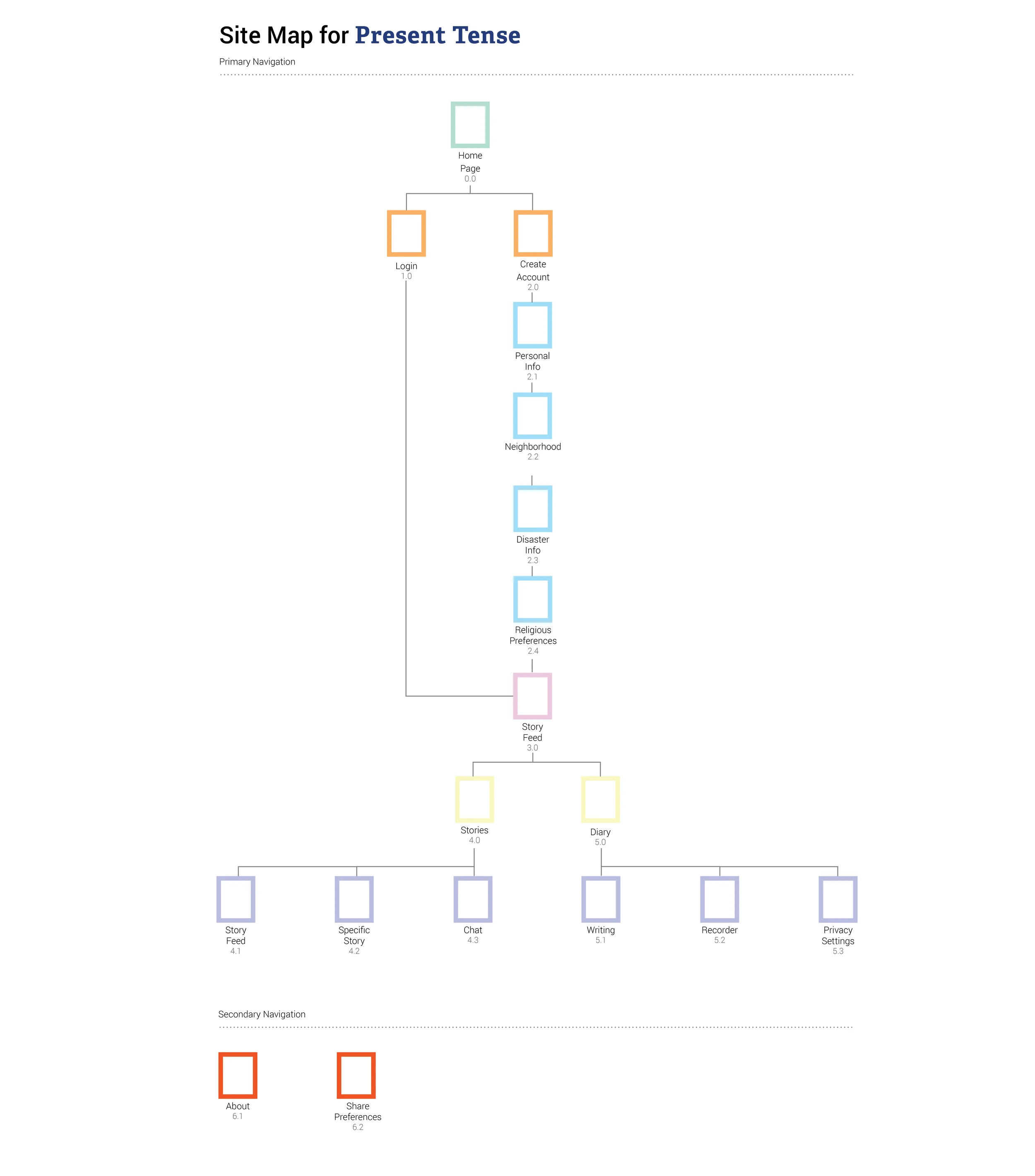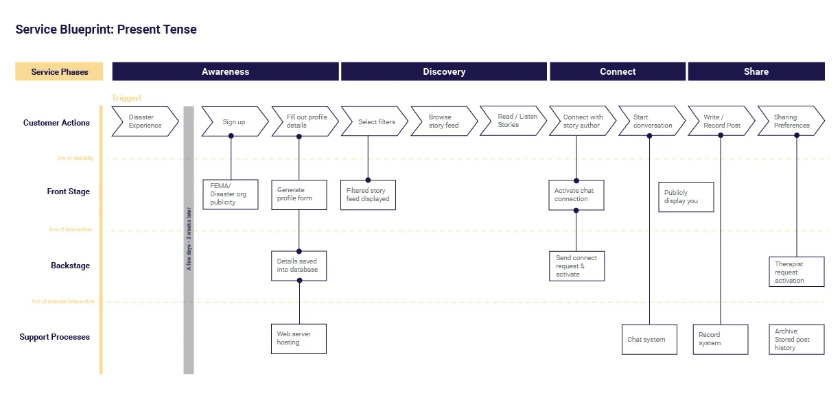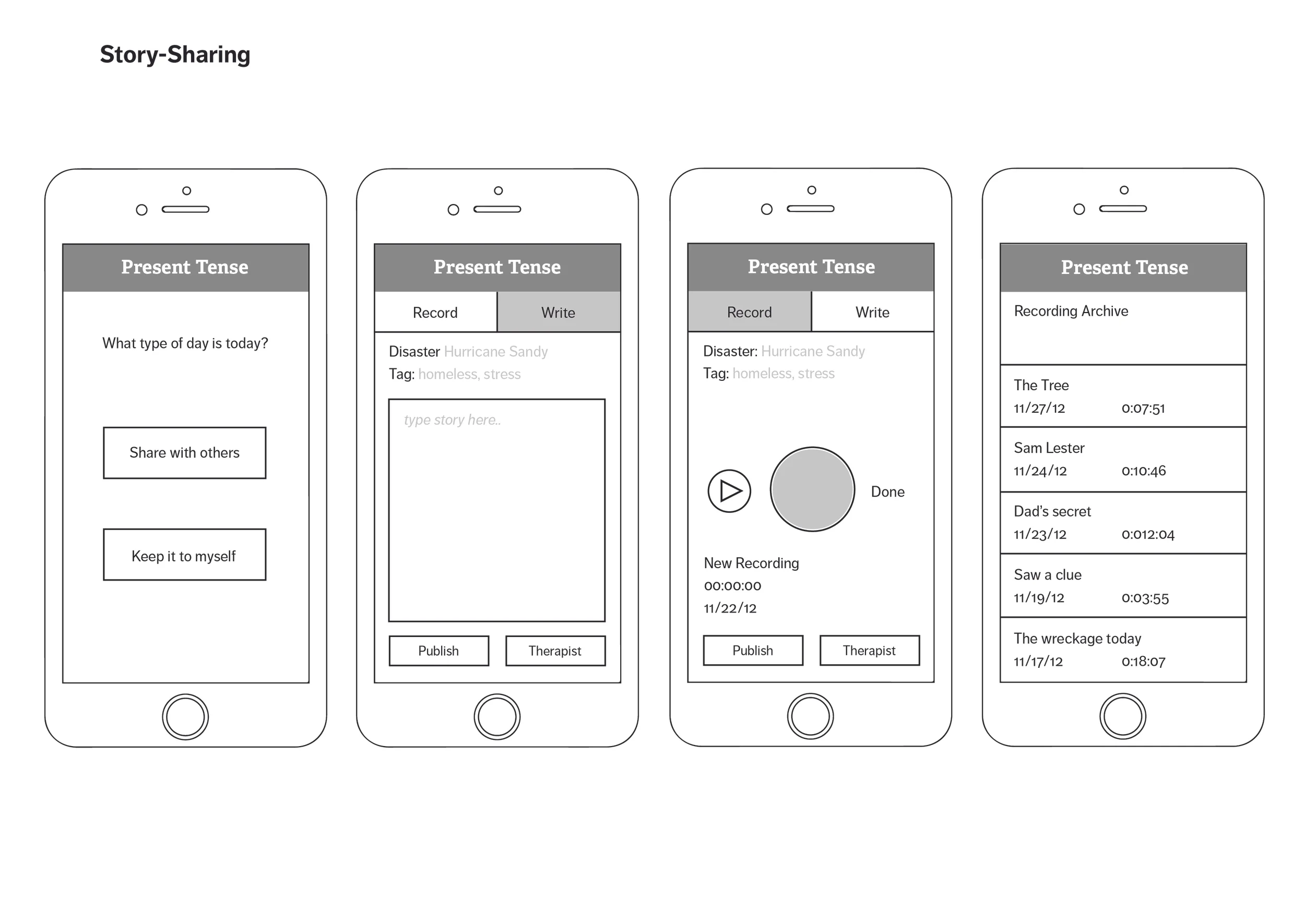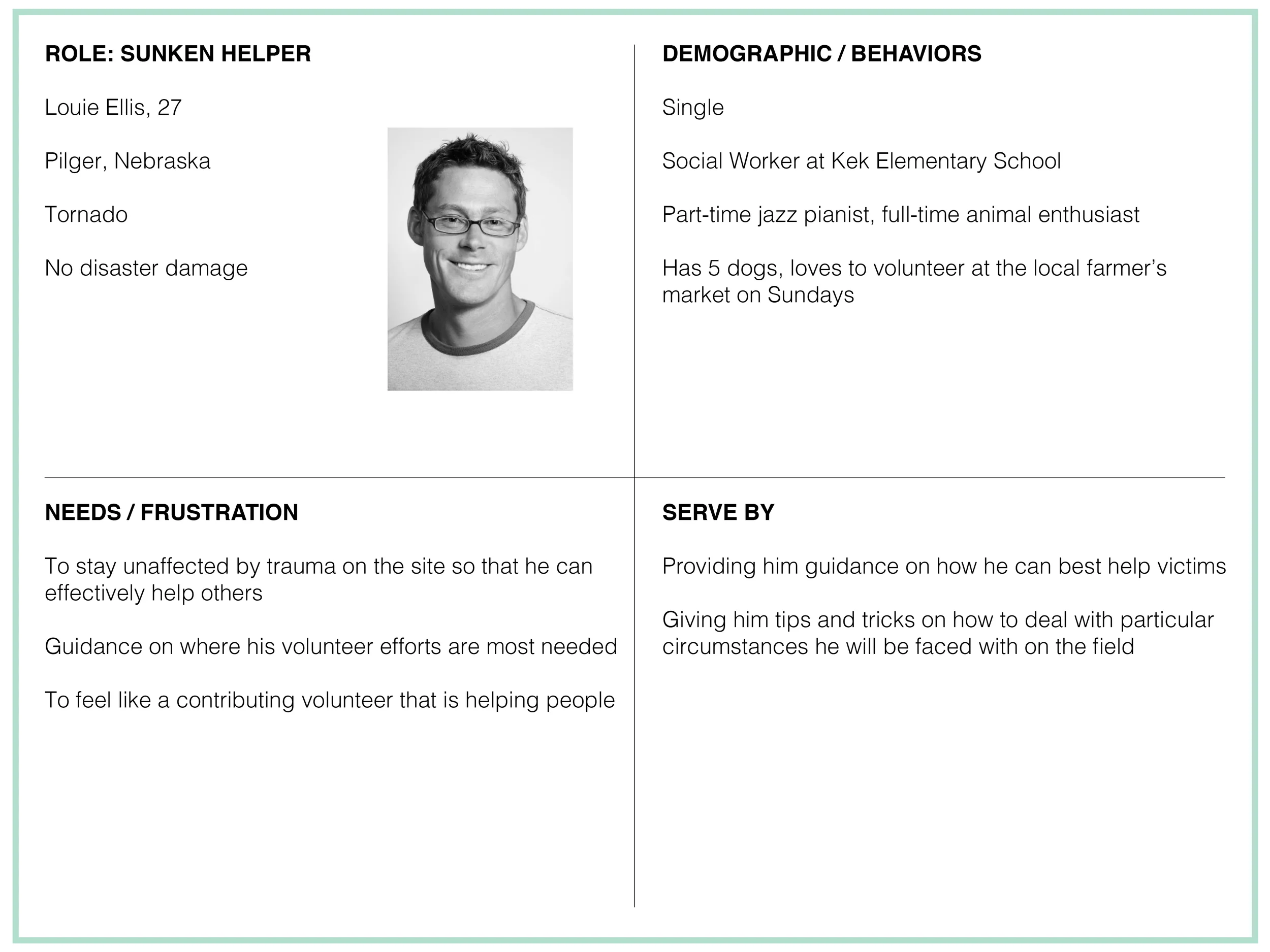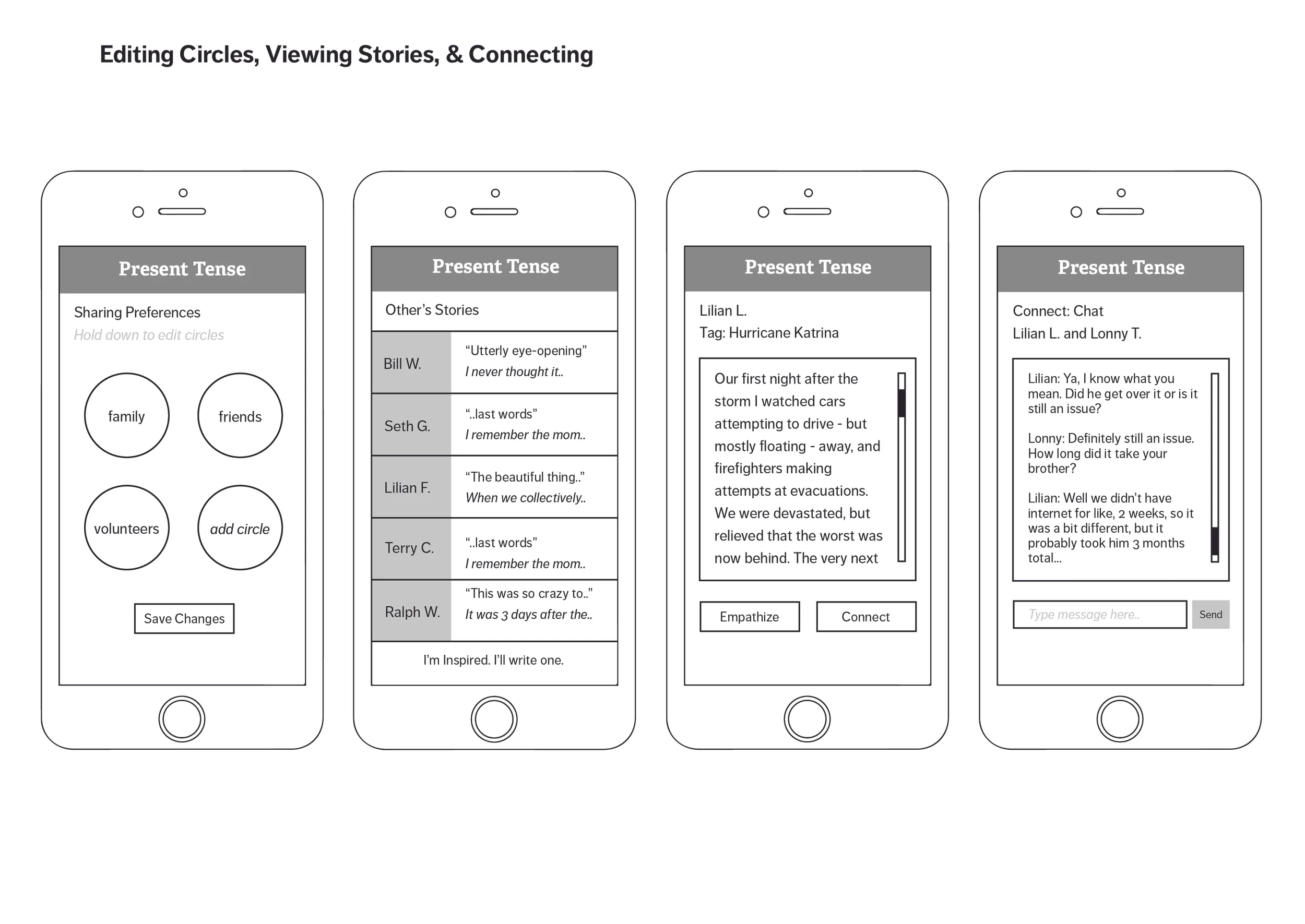 I started off by creating 4 personas as a representation of the goals and behavior of real disaster survivor types. I use these as a guidance when envisioning the future product offerings for mental relief. The Present Tense service has a place for all the users.