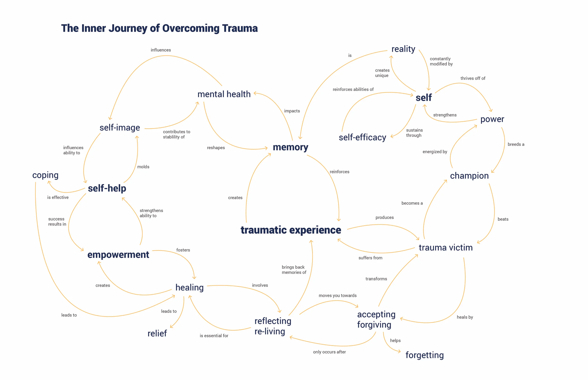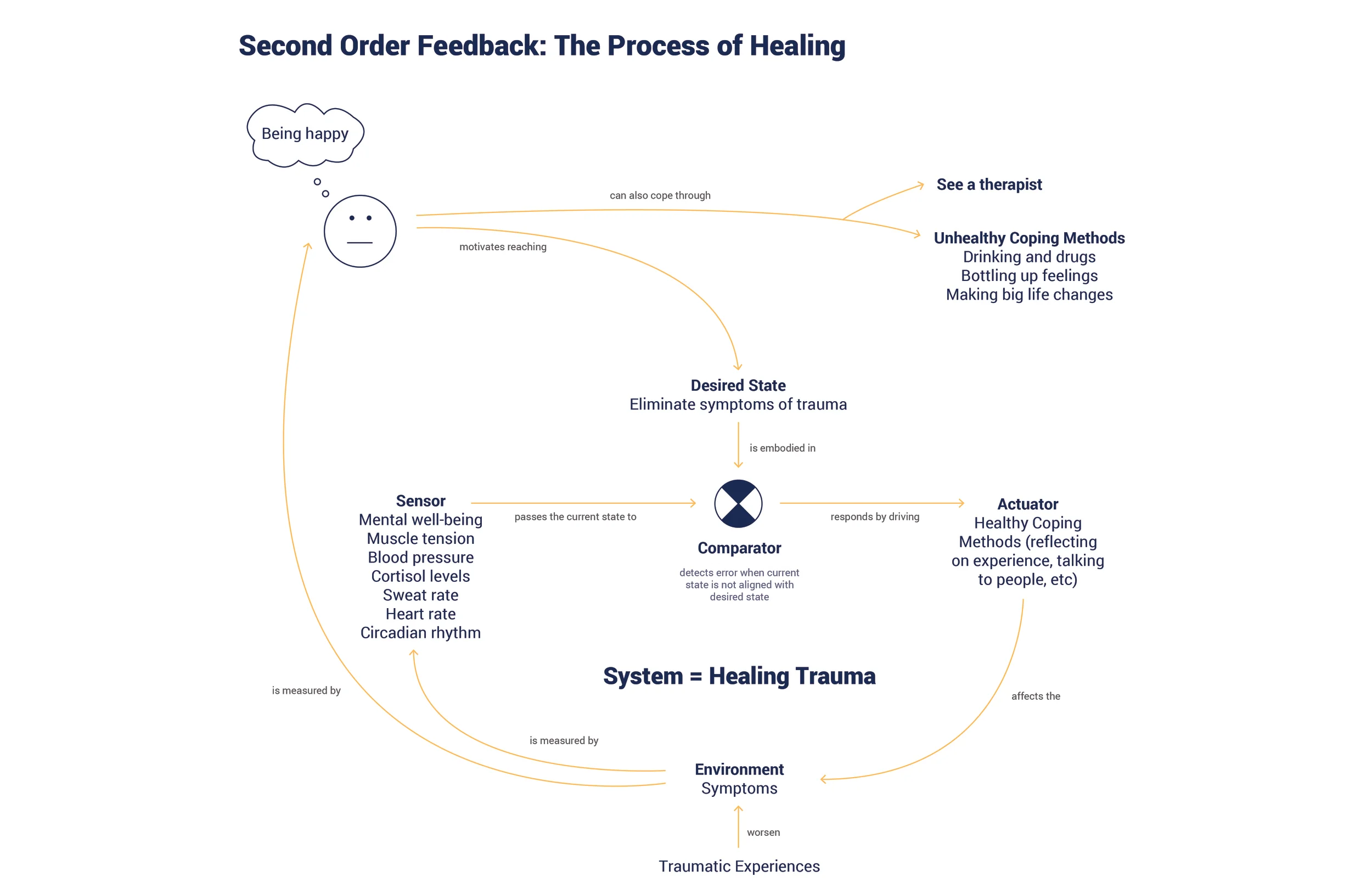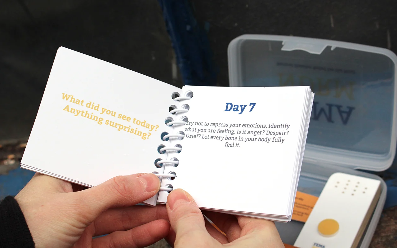 Using design as the bridge between science and the people, Ayaydin was inspired by a conversation with Barry Kosofsky, Chief Neurologist at Weill Cornell Medical Center, who explained that his recent studies show “extinction is not erasing old memory, but rather placing down a new one. This has tremendous implications for how we should treat people suffering from PTSD.” This conversation, in conjunction with other neurologist and memory researcher interviews, led to an insight that reveals something innate to humans: we’re always trying to remember, and we forget to forget. It turns out in order to heal, we must forget, and in order to forget, we must remember. Mapping out the journey of overcoming trauma quickly revealed this key part of the healing process – reflecting and reliving as a method of coping.