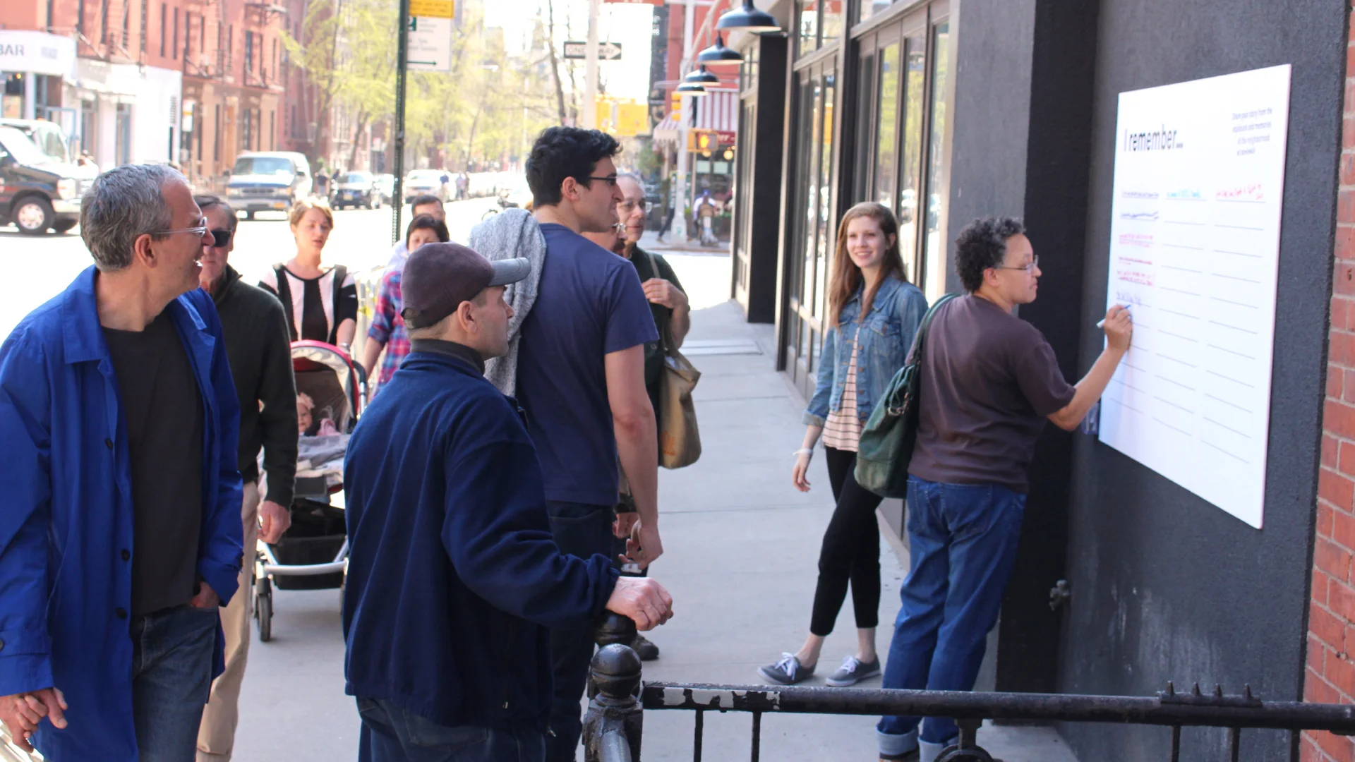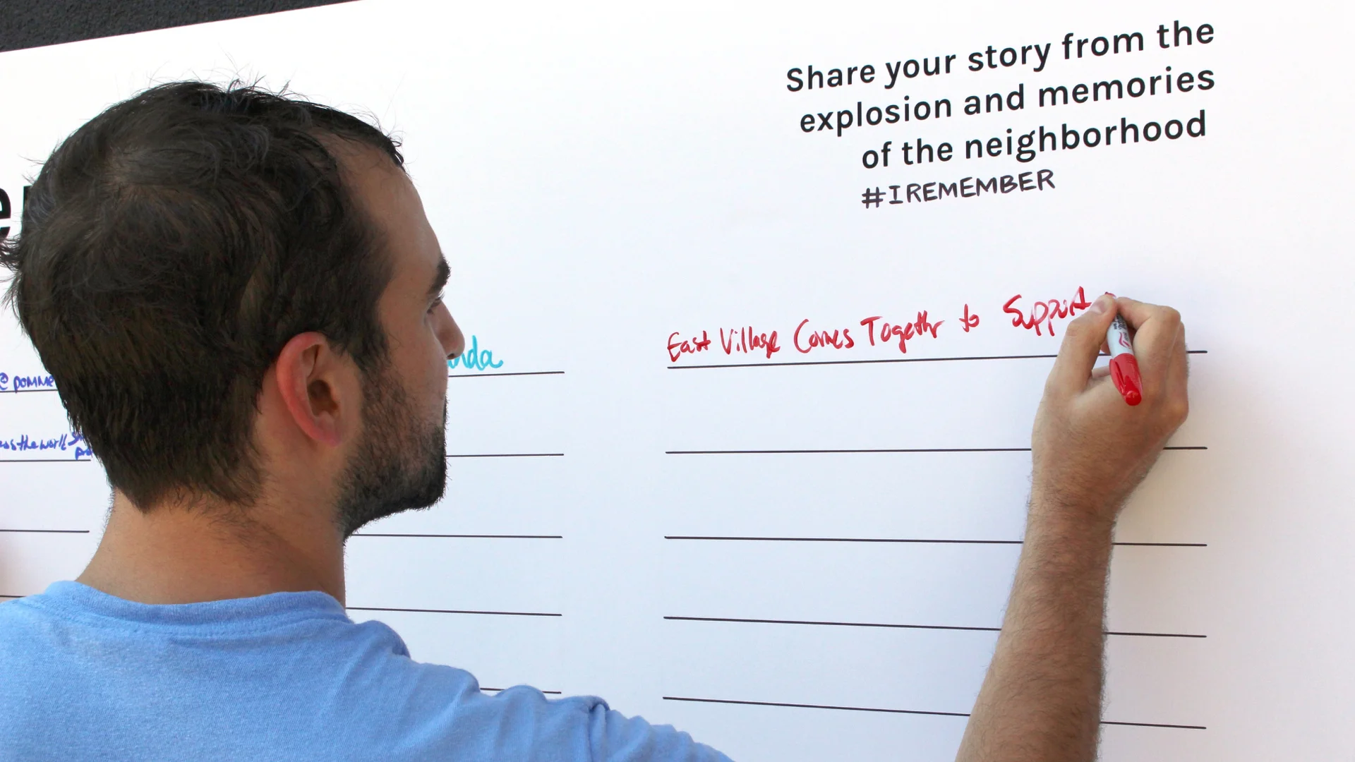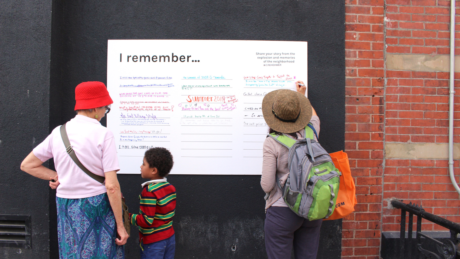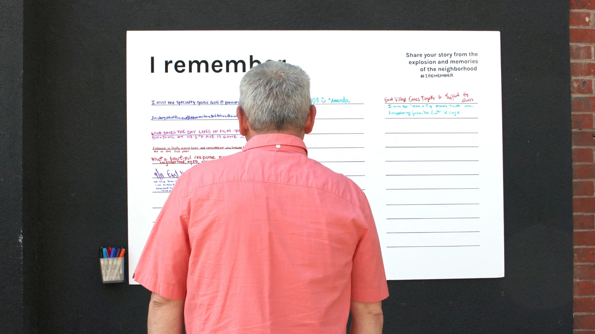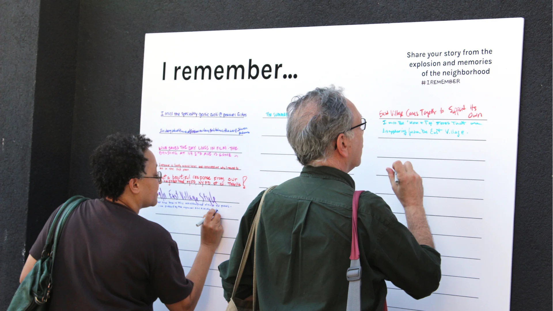 To test how effective sharing experiences a couple weeks after a disaster can be, Ayaydin designed an experience for a disaster closer to home. On March 26, an explosion in the East Village left a block up in flames, injuring 19, killing 2, and shocking the region. A few weeks after, Ayaydin posted a board across the street from the scene that invited people in the neighborhood to share their stories – general uplifting memories about the neighborhood or stories specifically from the explosion itself.