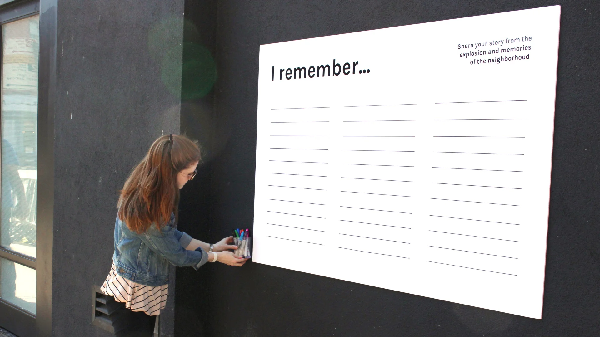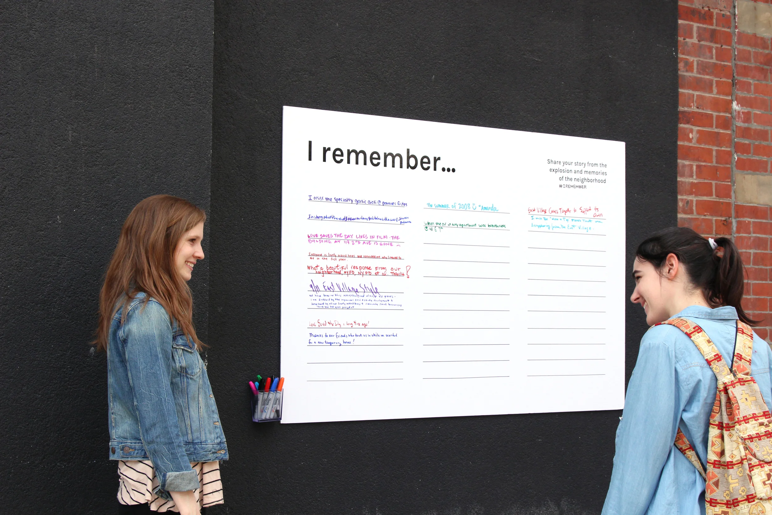 The piece prompts people to fill in the blank “I remember..” and it became a channel for starting conversations. People wrote memories, such as, “I remember getting on scene and having an immediate urge to help. Sad day.” One woman pointed across the street to the building facing towards the empty block and said, “You see the third floor window there? That’s my apartment. I still haven’t been able to move back in.” She wrote a note about how she’s thankful for the support she’s received from family and friends.