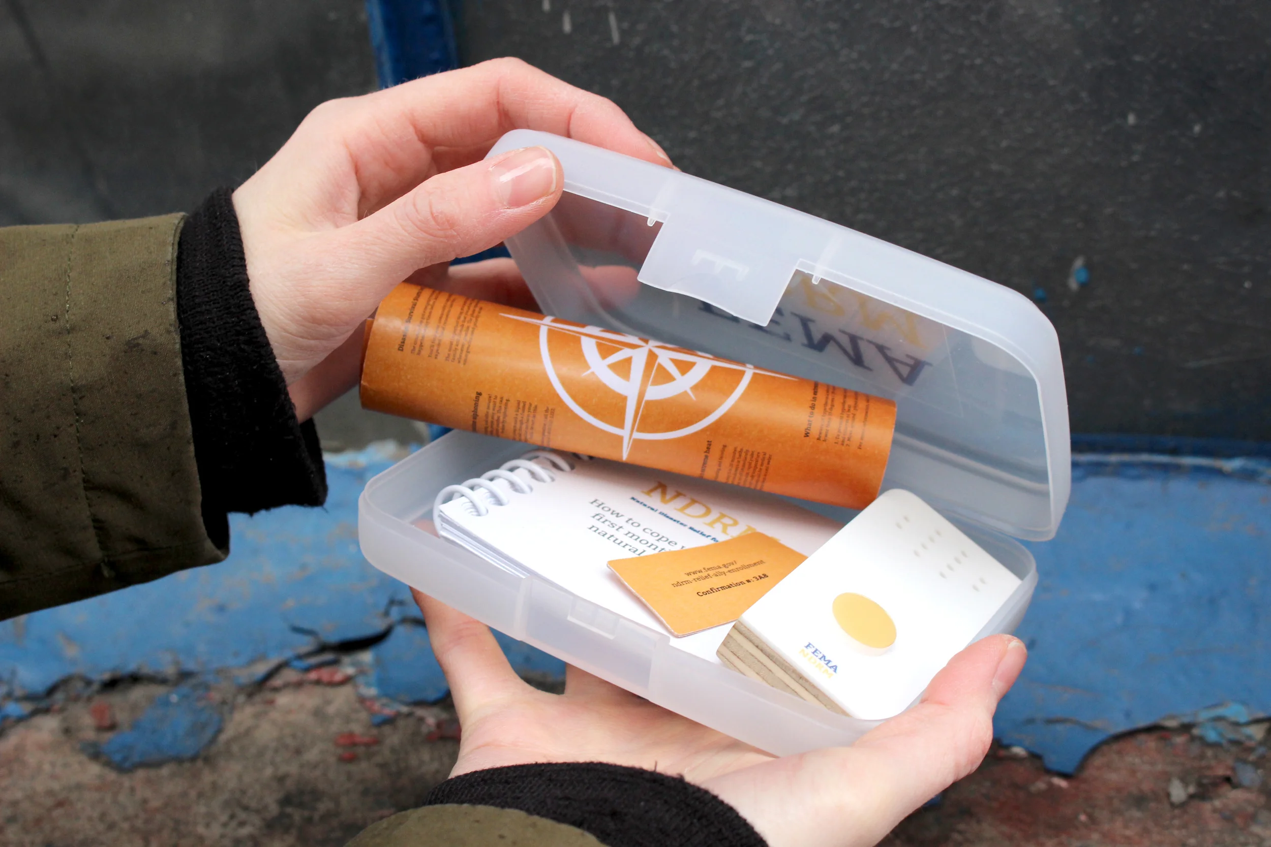 The Natural Disaster Relief for the Mind (NDRM) kit proposed here in I Was There When is first a service, starting with a kit that one receives after experiencing a disaster. This is not intended to be a catch-all, as what a disaster survivor needs to do during a tornado is very different than what they need during a hurricane, and the level of disaster each individual experiences is relative. Hence, this is a first round attempt at building a model that speculates what the primary needs of natural disaster victims are and how they can be addressed. The kit does, however, capture the overall goal and opportunity of this project, which is to empower people by giving them the tools they need to help themselves. Of course, a victim’s needs are dependent on the context of their situation. Also, it is clear that there are systemic limitations for both implementing a new service and distributing kits. The kit itself is a set of tools that address a hierarchy of needs.